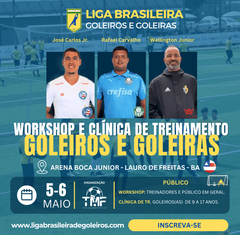 A Liga Brasileira de Goleiros e Goleiras tem o prazer de anunciar o Workshop e Clínica de Treinamento de Goleiros, que será realizado nos dias 5 e 6 de maio em Lauro de Freitas - BA na arena boca júnior. Este evento contará com a participação dos treinadores da liga brasileira, Rafael Carvalho (Palmeiras), José Carlos Junior (E.C Bahia) e o treinador mental Wellington Junior.